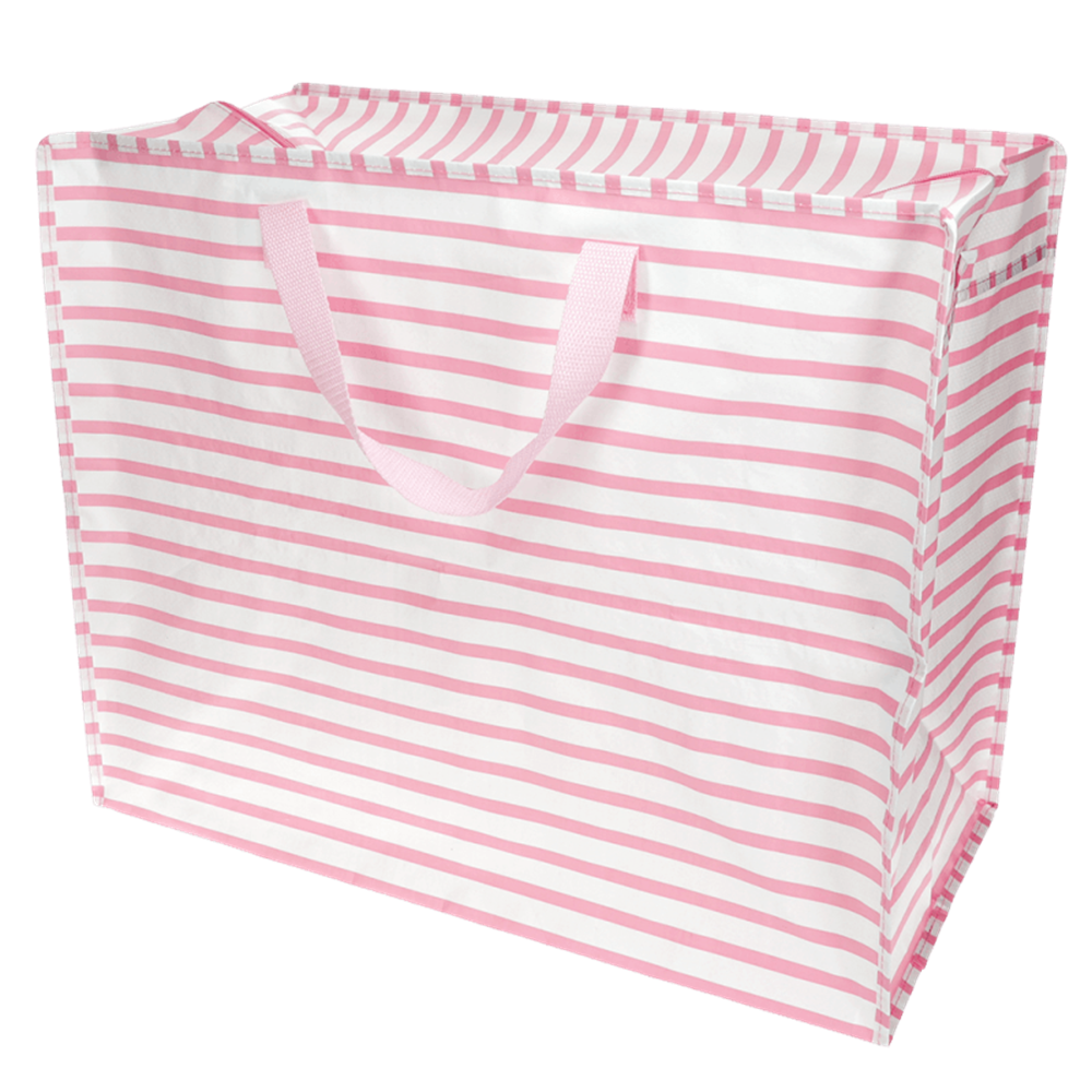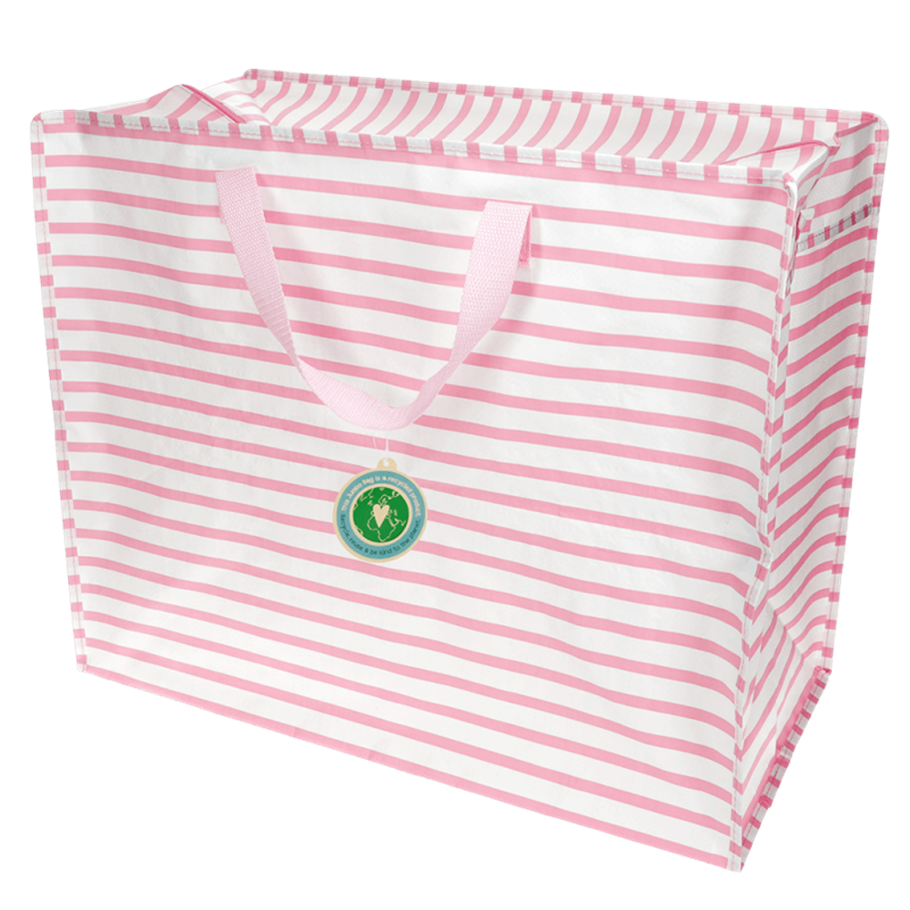 Diese pink gestreifte Aufbewahrungstasche ist ein stilvoller Alleskönner, der Ihr Zuhause von Unordnung befreit. Sie besteht aus recyceltem Kunststoff und bietet Platz für alles, von Bettwäsche und Kleidung bis hin zu Spielzeug und Wäsche. Egal, ob Sie umziehen, die Kinder in die Freizeit bringen oder einfach eine clevere Aufbewahrungslösung brauchen, diese vielseitige Tasche ist eine tolle Alternative zu sperrigen Kartons. Mit Reißverschluss und zwei starken, gewebten Nylongriffen in Braun. Lässt sich bei Nichtgebrauch flach zusammenfalten und leicht verstauen. Hergestellt aus bis zu 90 % recyceltem Kunststoff.